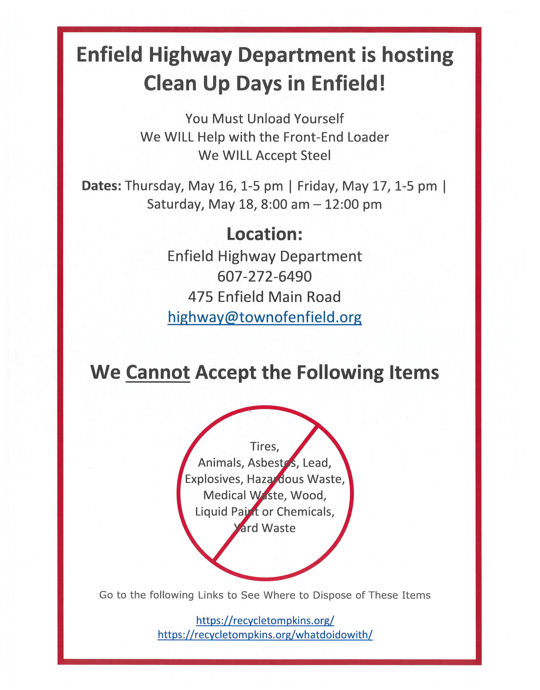 Enfield Town Clean-Up May 16-18, 2024.Mary CornellApril 18, 2024Enfield Community, Highway Department