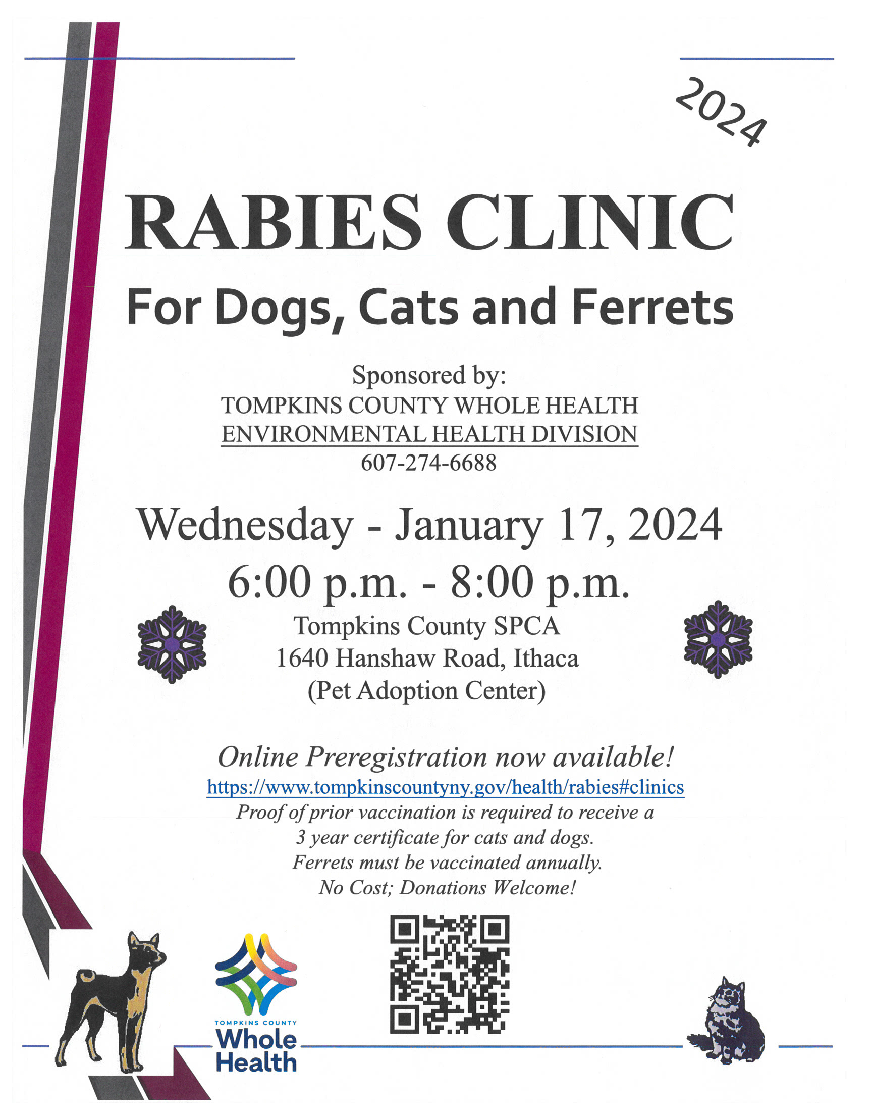 Rabies Clinic – January 17, 2024; 6:00 – 8:00 PM @Tompkins County SPCA, 1640 Hanshaw Road, Ithaca.